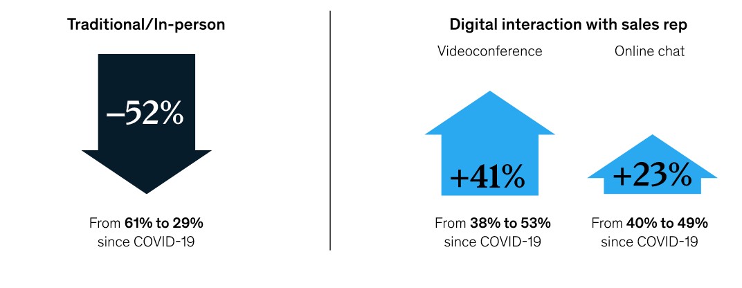 Mellan april och oktober 2020 ökade intäkterna genererade från videomöten med 69 procent. De allra flesta köpare uppskattar också videomöten före telefonsamtal. Tillsammans med e-handel utgjorde videosamtalen 43 procent av alla B2B-intäkter 2020. Det är mer än någon annan kanal.
