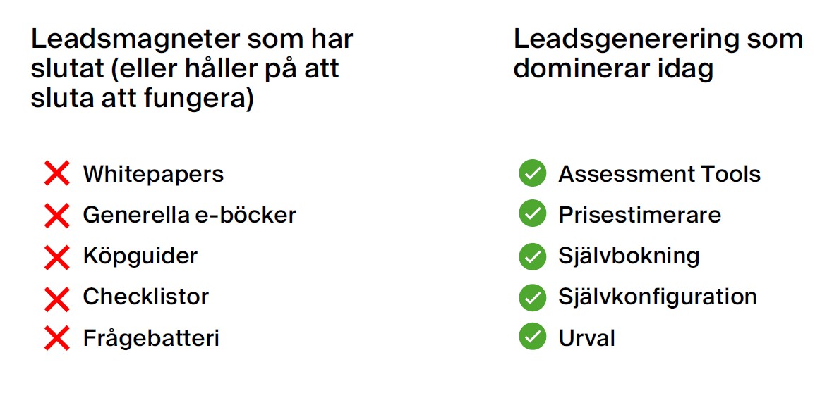 Detta har också lett till att de bästa leadsen idag inte är de som laddat ner en e-bok eller kollat på ett webinar. De är de som planerar ett köp. Skillnaden är att denna typ av process mer eller mindre bara skedde i ett säljmöte innan – men har nu tagit plats på företagens webbplatser.